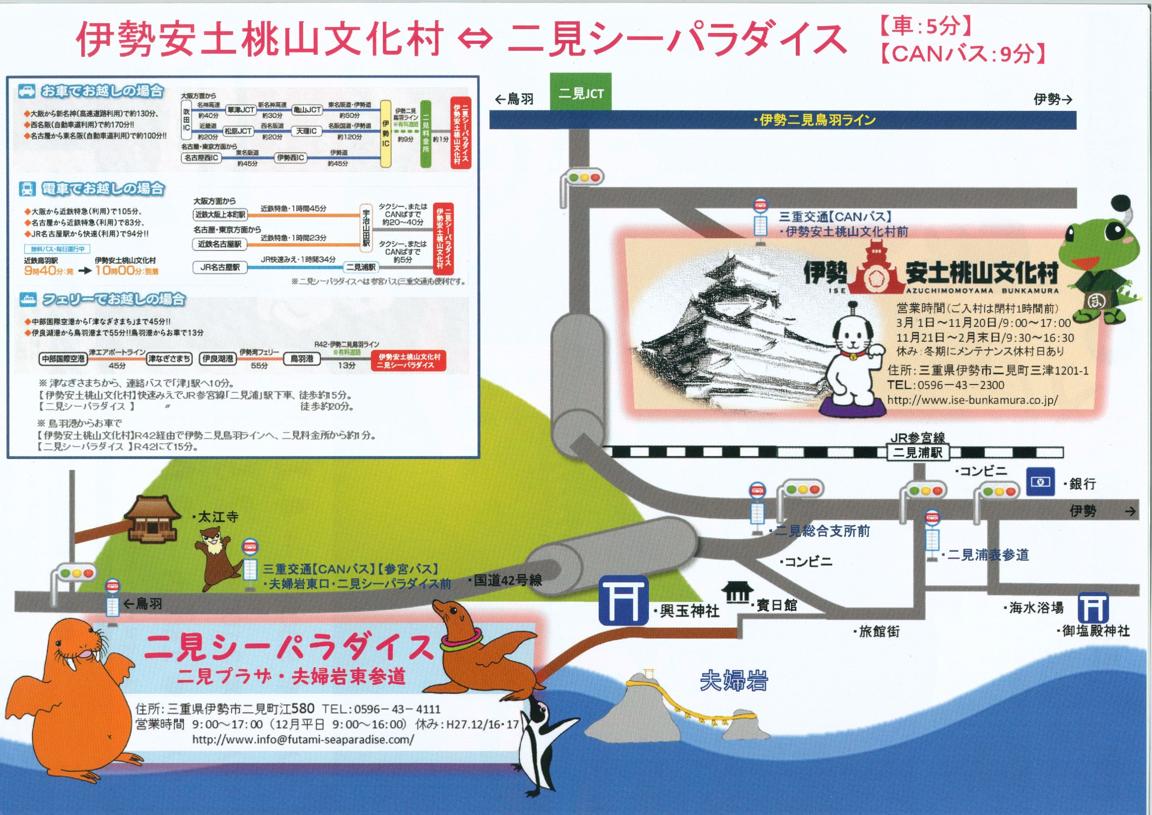 伊勢市制施行10周年と、夫婦岩パラダイス50周年を記念いたしまして、「伊勢安土桃山文化村」と「二見シーパラダイス」の2施設入れる共通券が発売されます。