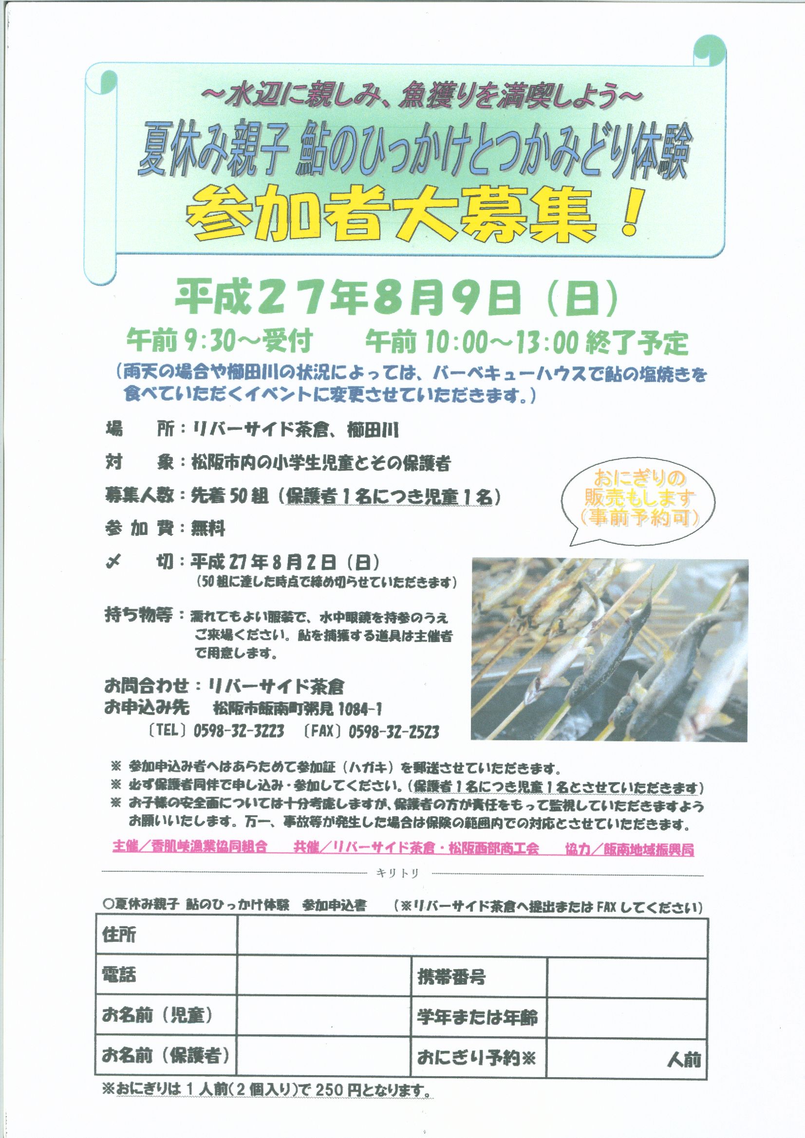平成27年8月9日(日)夏休み親子 鮎のひっかけとつかみどり体験 参加者募集のお知らせ/リバーサイド茶倉