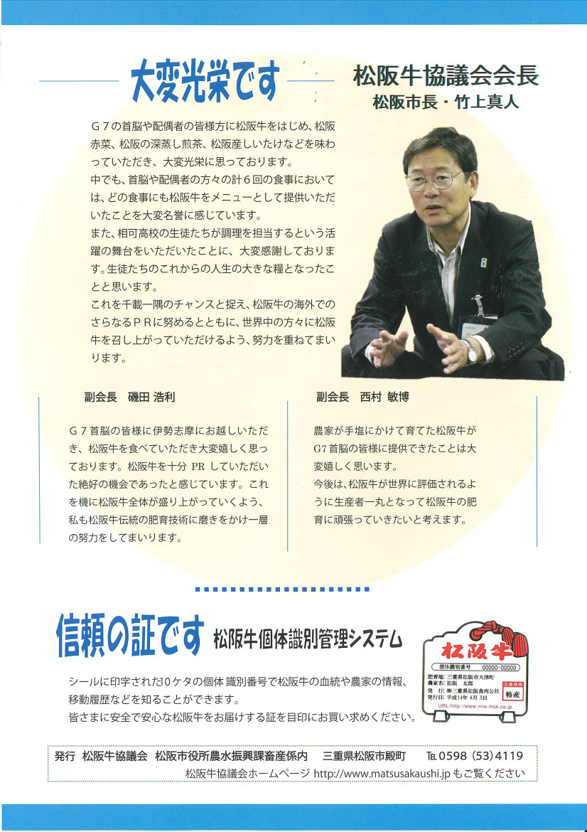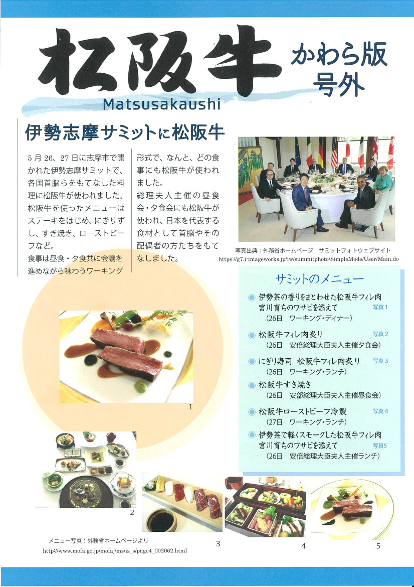 5月26日、27日に志摩市で開かれた伊勢志摩サミットで、各国首脳らをもてなした料理に松阪牛が使われました。