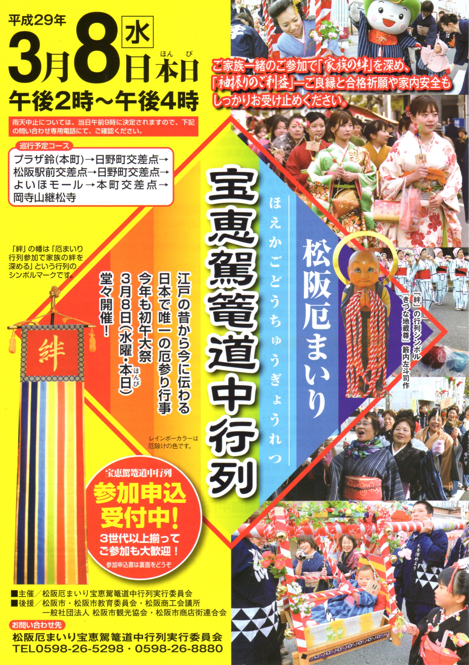 お問い合わせ先:松阪厄まいり宝恵駕篭道中行列実行委員会 TEL0598-26-5298、0598-26-8880