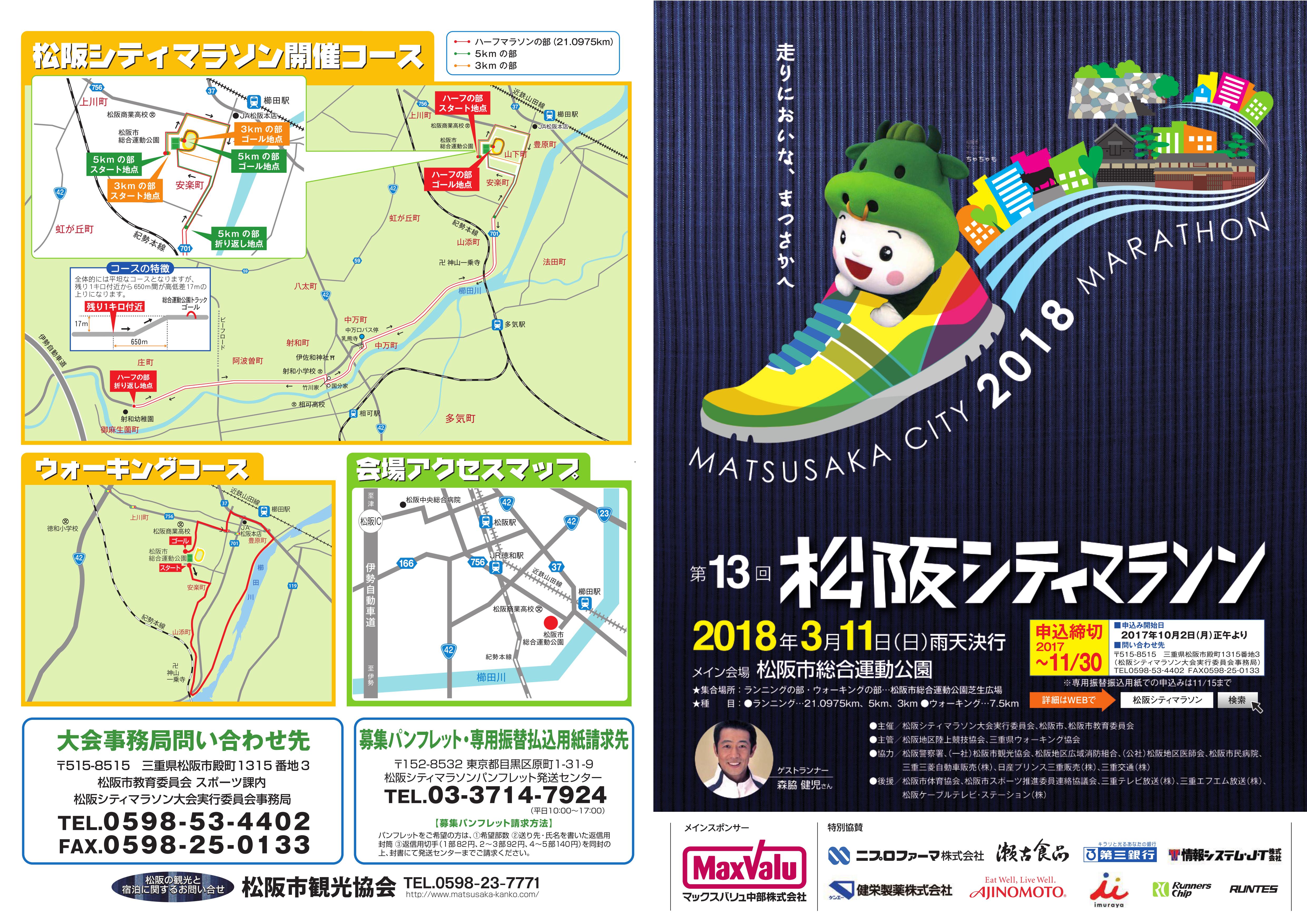 第13回 松阪シティマラソン 2018年3月11日(日)午前9時~(開会8時)※雨天決行 ●ところ/総合運動公園(山下町) ●対象/18歳未満の方は、保護者の記名押印がある「承諾書」が必要 ●種目/①ハーフマラソン(21.0975km) ②5km ③3km ④ウォーキング ●参加料/①ハーフマラソン 一般・高校生 4,000円 ②・③5km・3km 一般3,000円・18歳以下 1,000円 ④ウォーキング 一般1,500円・小学生以下500円 ●申込方法/11月15日(水)【インターネットは11月30日(木)】までに、 スポーツ課・各教育事務所・各市民センターに設置してある開催要項に基づいてインターネット、携帯サイト、振込(各郵便局窓口)で申込手続きをして下さい。 ●ゲストランナー/森脇健児さん 詳しくはコチラ⇒http://matsusaka-marathon.jp/