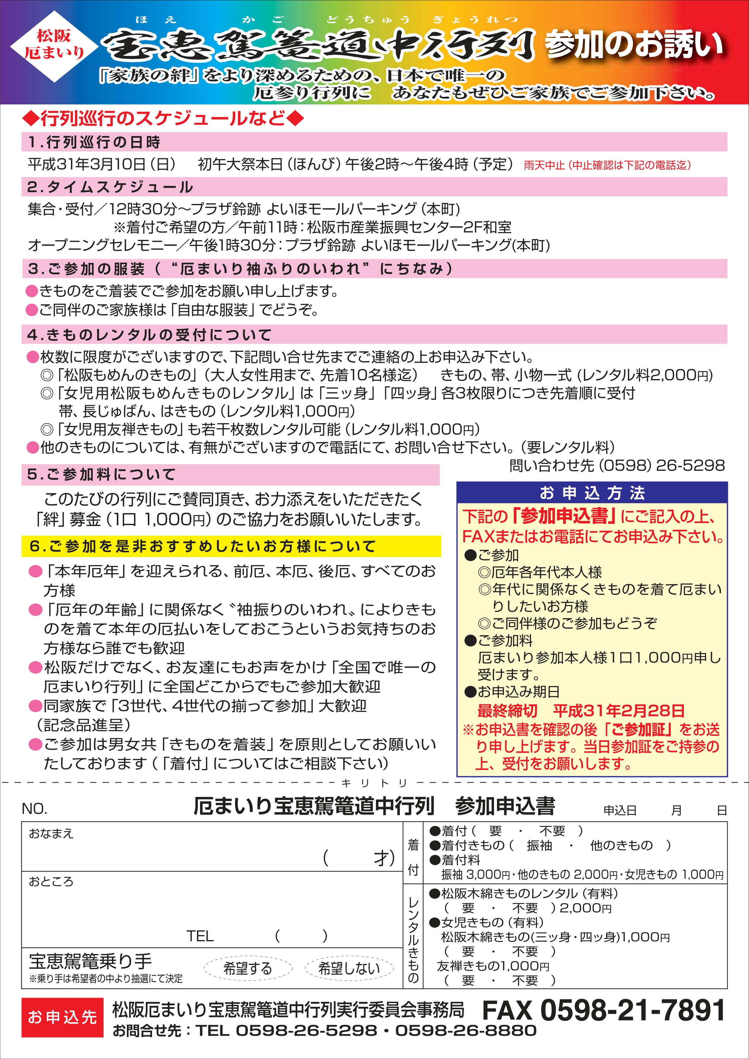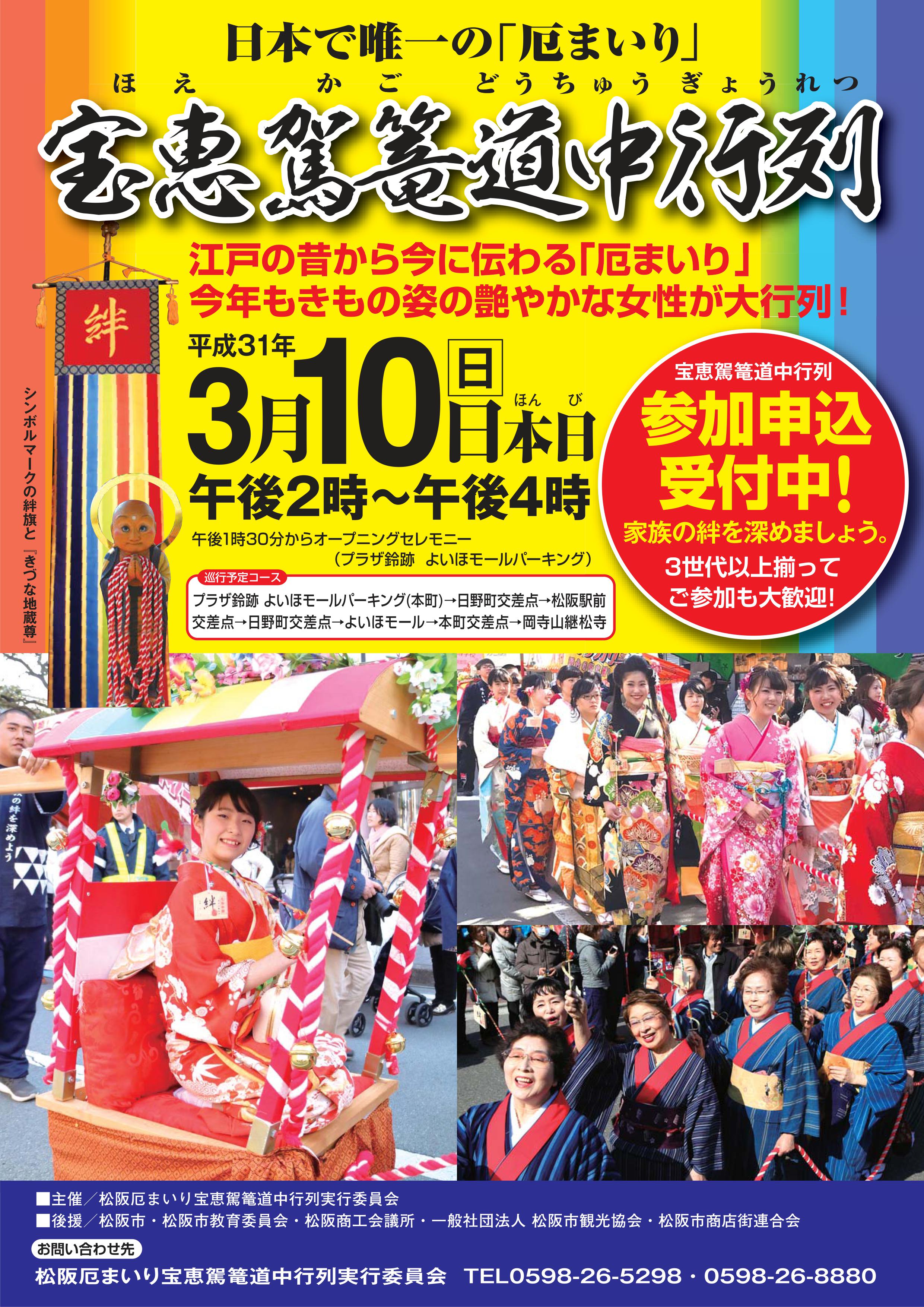 お問い合わせ先:松阪厄まいり宝恵駕篭道中行列実行委員会 TEL:0598-26-5298、0598-26-8880