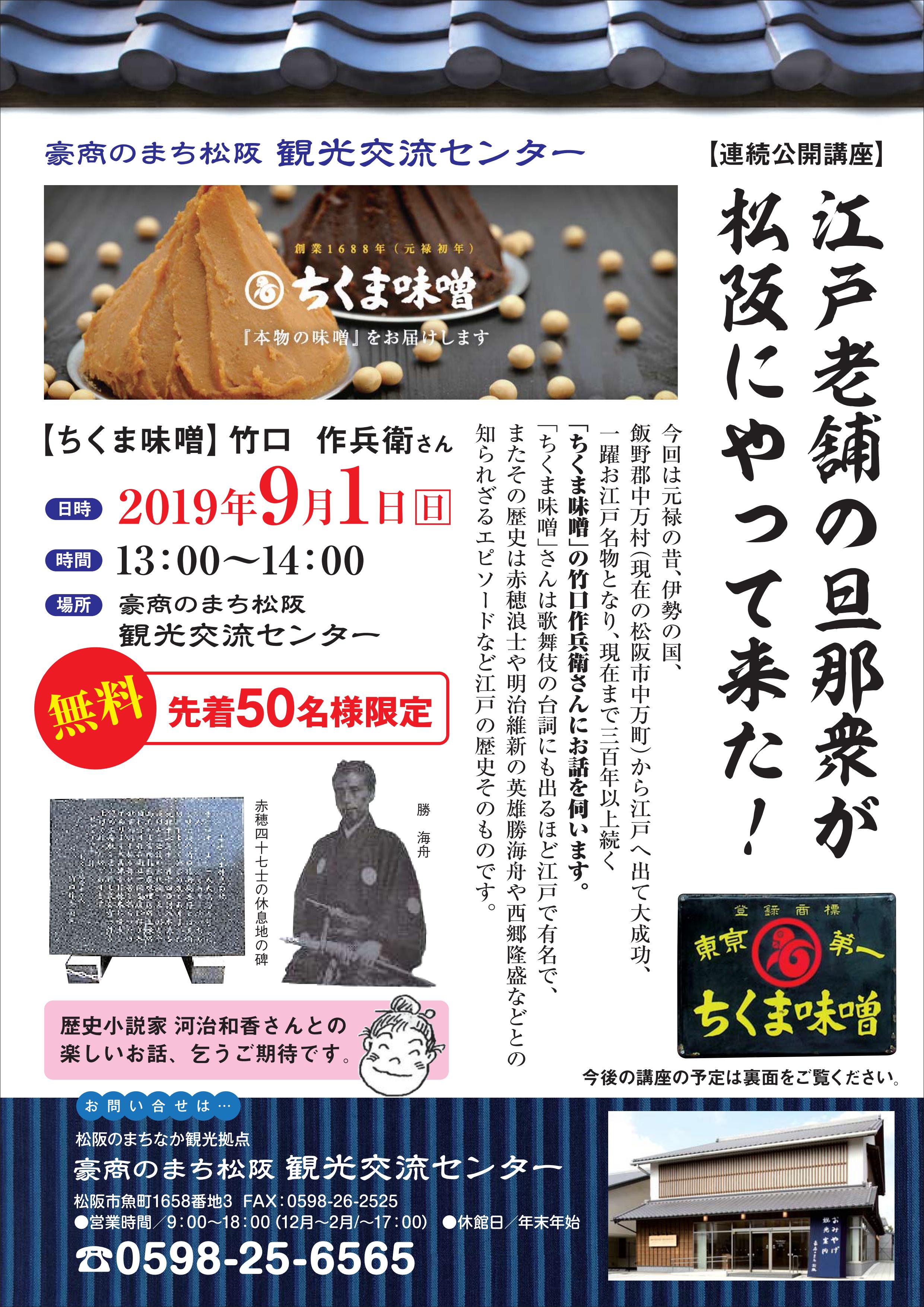 2019 年9月1日(日)13:00~「江戸老舗の旦那衆がやって来た!」ちくま味噌17代目 竹口 作兵衛さま