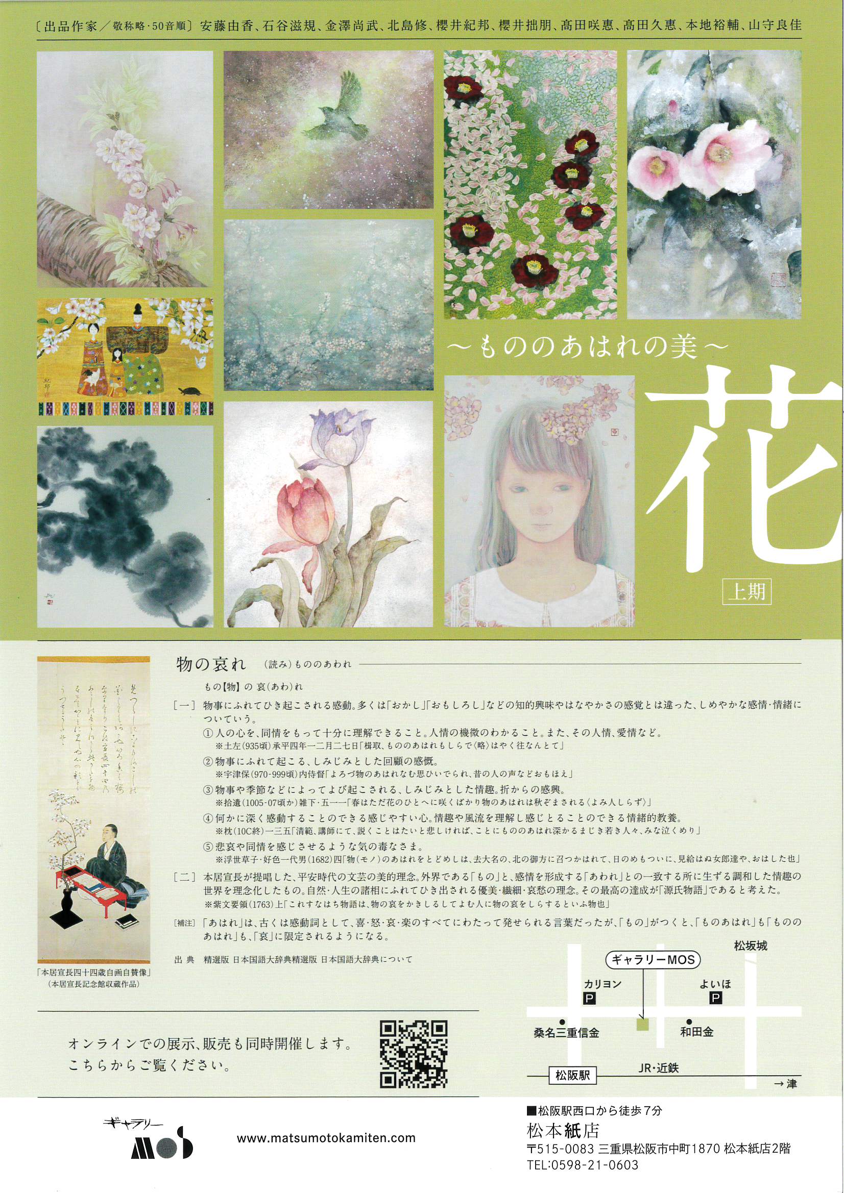今回、『もののあはれの美』をテーマに、日本画、水墨画、油彩画、水彩画の作品を展示いたします。桜をこよなく愛した本居宣長の地元松阪で、それぞれの作家の「桜」と「花」の世界をどうかお楽しみください。