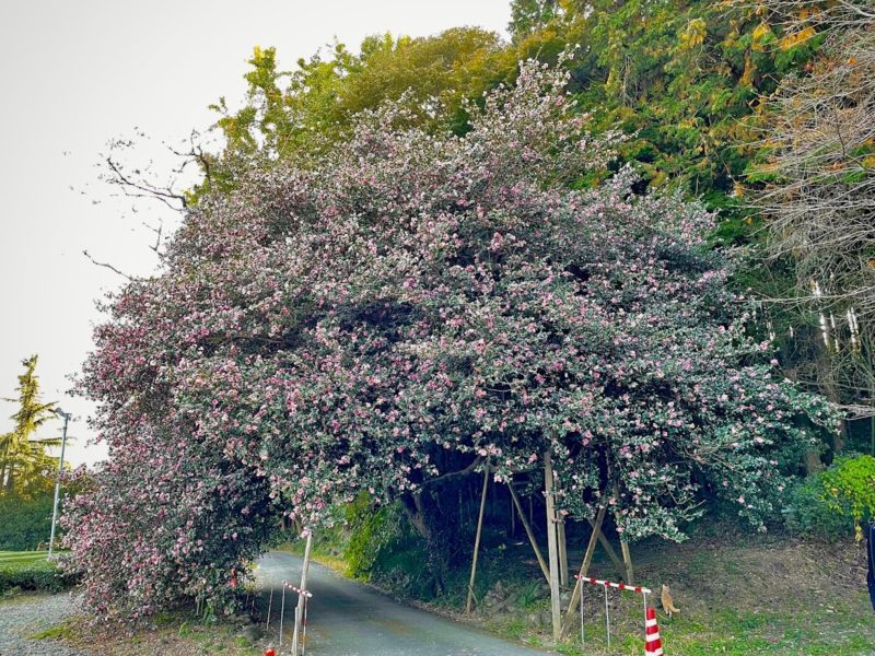 飯南町粥見にあるサザンカの大木は、推定樹齢150年以上、高さ約12メートル、幹まわりは約1.5メートル、直径約10メートル程に枝を広げています。