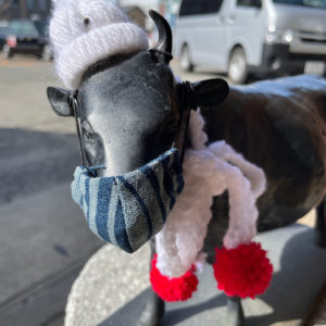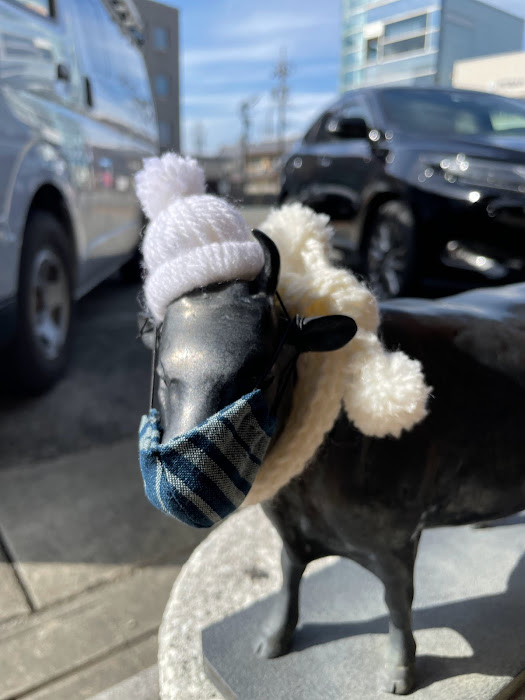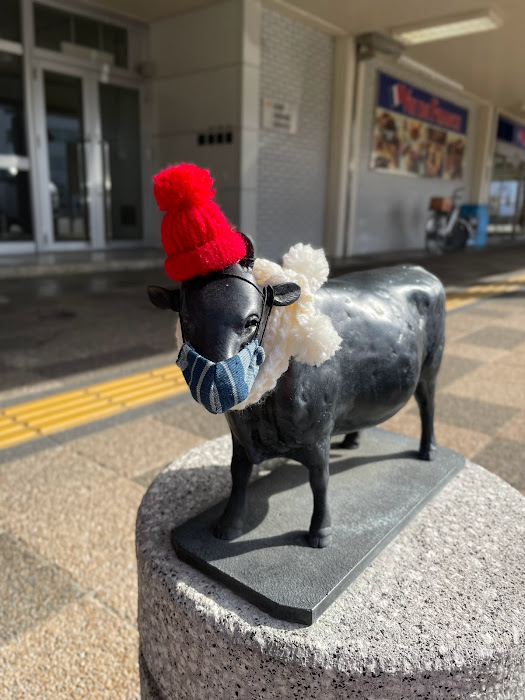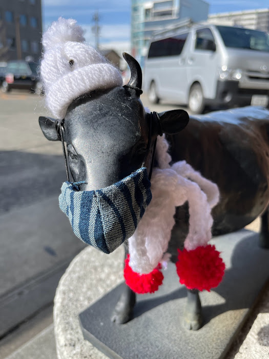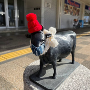 松阪駅前の牛さんがお正月仕様から、キュートな冬のコーディネートになっています。
