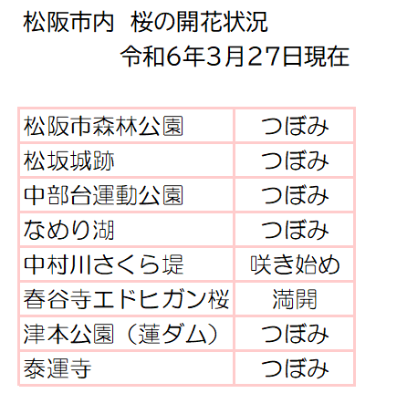 松阪市内の桜の開花状況 【令和6年3月27日現在】