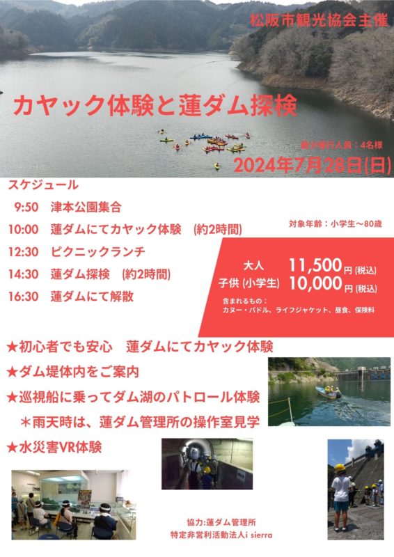 7月28日(日)”10名限定”『カヤック体験と蓮ダム探検』 ~松阪市観光協会主催~