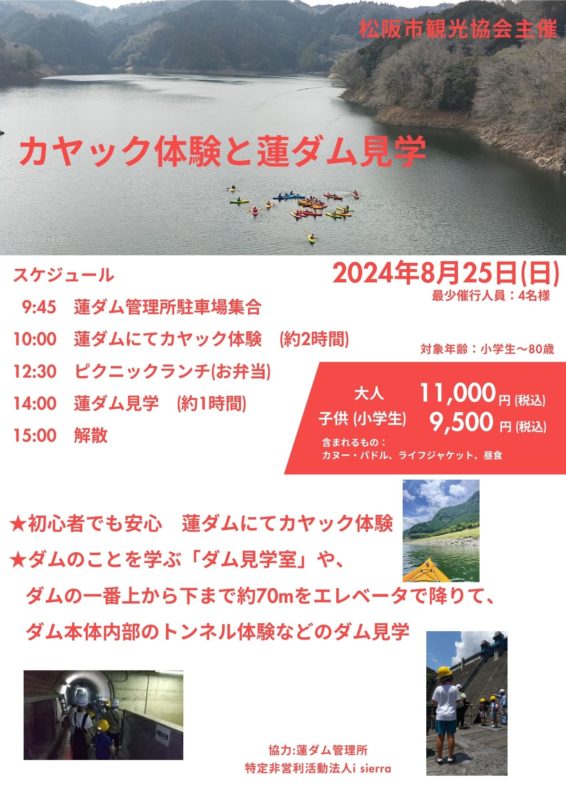 8月25日(日)”10名限定”『カヤック体験と蓮ダム見学』 ~松阪市観光協会主催~