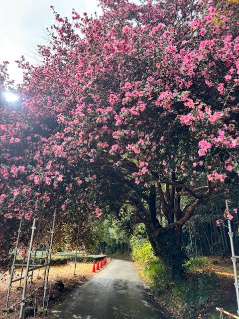 今年は台風の通過がなくサザンカの蕾が落ちることなく、たくさん咲き誇り巨木全体がピンク色に染まっています。日本最大級のサザンカ。花の重みで枝がしだれトンネルのようになっています。もう少しで地面に着いてしまいそうな程に垂れ下がっているところもあります。