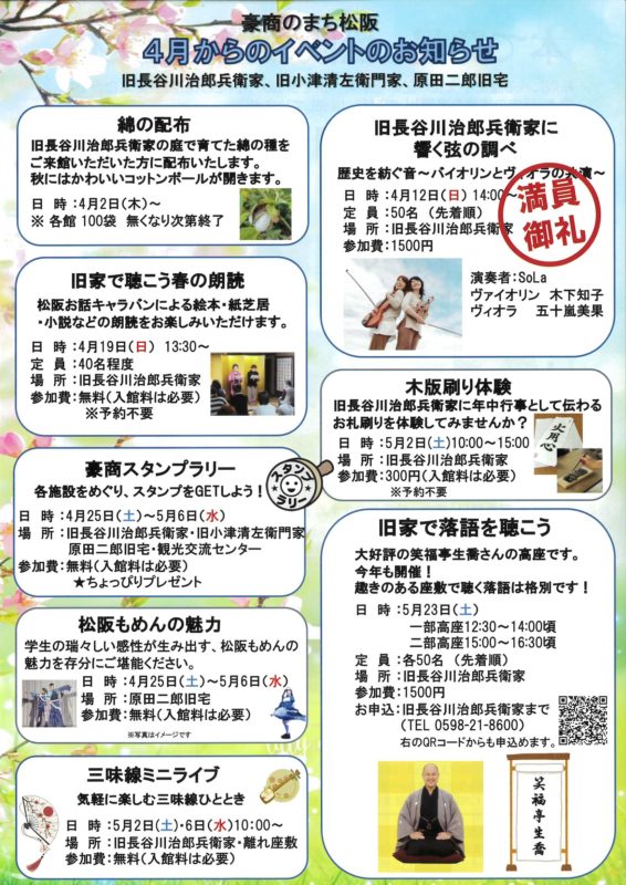 豪商のまち松阪 4月からのイベントのお知らせ ~旧長谷川治郎兵衛家・旧小津清左衛門家・原田二郎旧宅〜