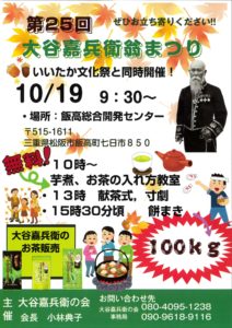 【日 時】 2025年10月19(日) 9:30~ ※雨天決行 【場 所】 飯高総合開発センター 〒515-1611 松阪市飯高町七日市850 【主 催】 茶王 大谷嘉兵衛の会